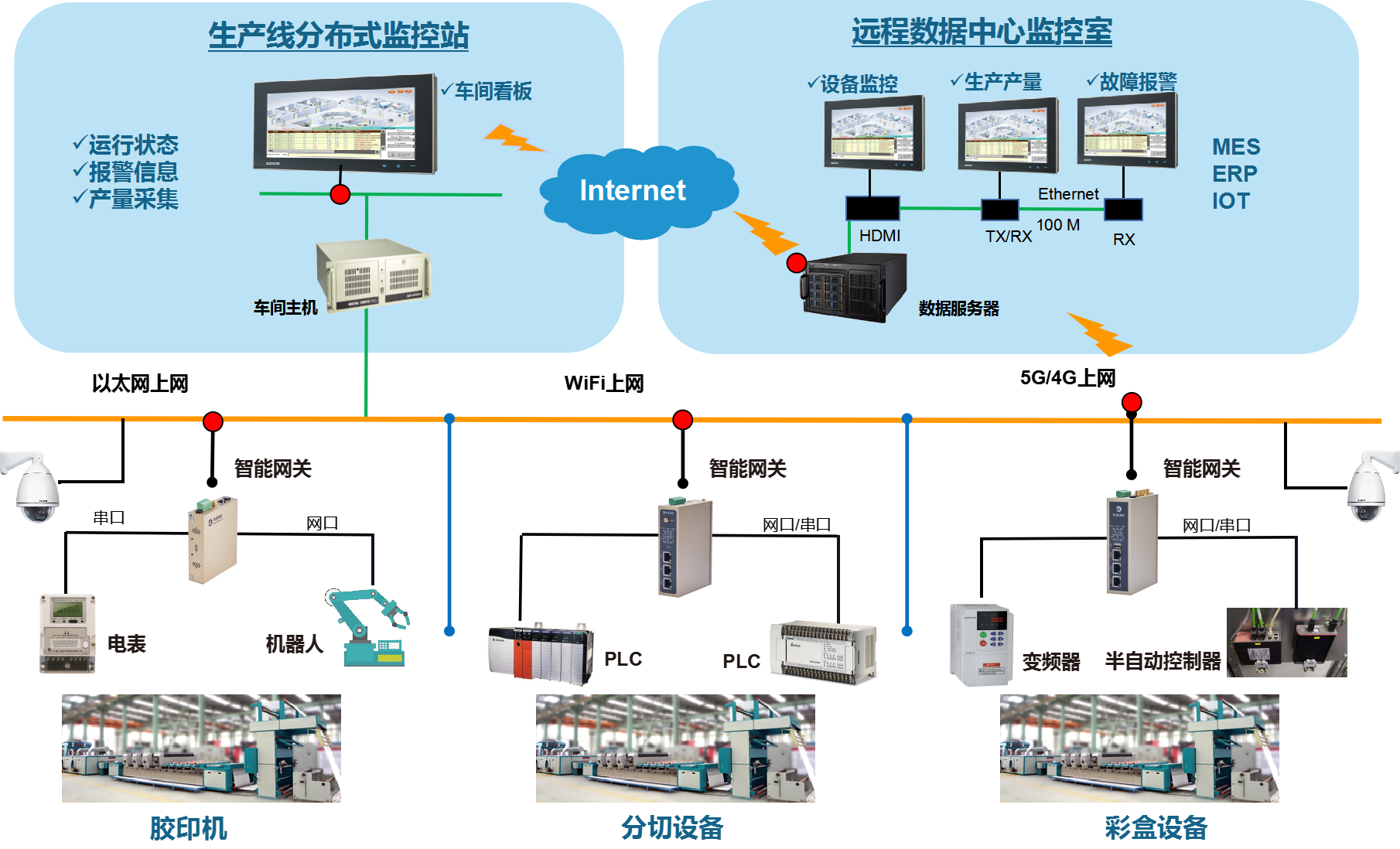 顺利获得long8龙8国际5G工业智能网关WG783采集工厂车间内的工业设备的数据,并在网关内实现边缘计算和数据标准化后将数据上传给车间看板及集团物联网云平台。在long8龙8国际设备数据云平台对数据进行清洗、计算、储存和分析后,顺利获得可视化报表和工业流程图等方式将工厂设备实时状态、生产状态等信息展现出来;设备异常时,自动顺利获得报警告警功能,通知管理运维人员,工程师可以顺利获得long8龙8国际设备维护快线及时进行远程维护,减少故障损失。