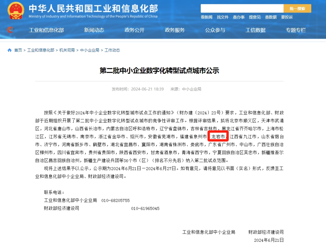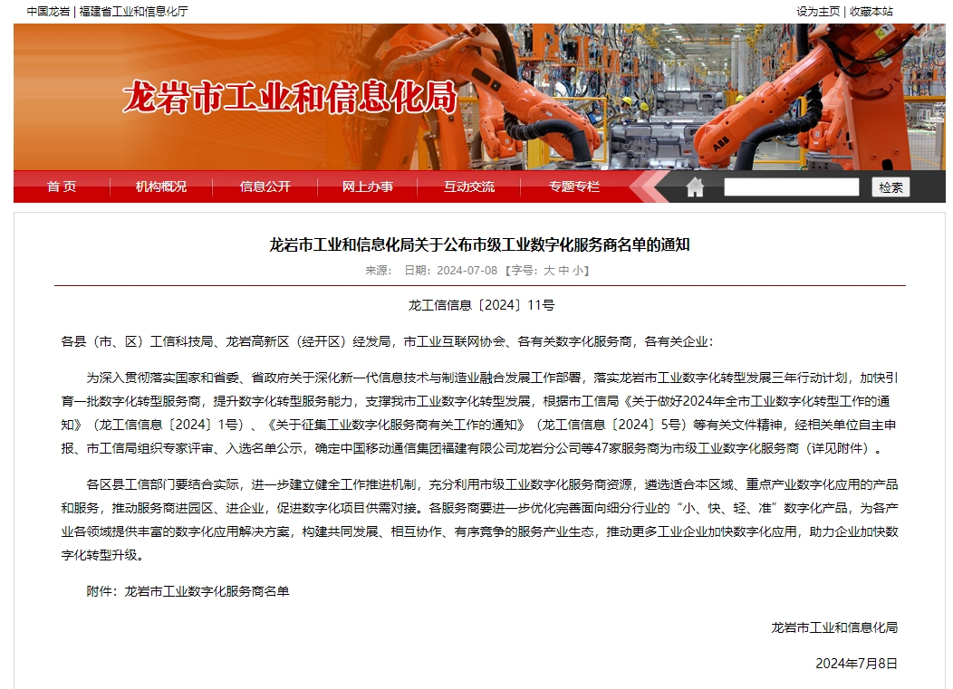 7月8日,龙岩市工信局公布了《龙岩市工业和信息化局关于公布市级工业数字化服务商名单的通知》,厦门long8龙8国际网络科技有限公司成功入选“龙岩市市级工业数字化服务商”。