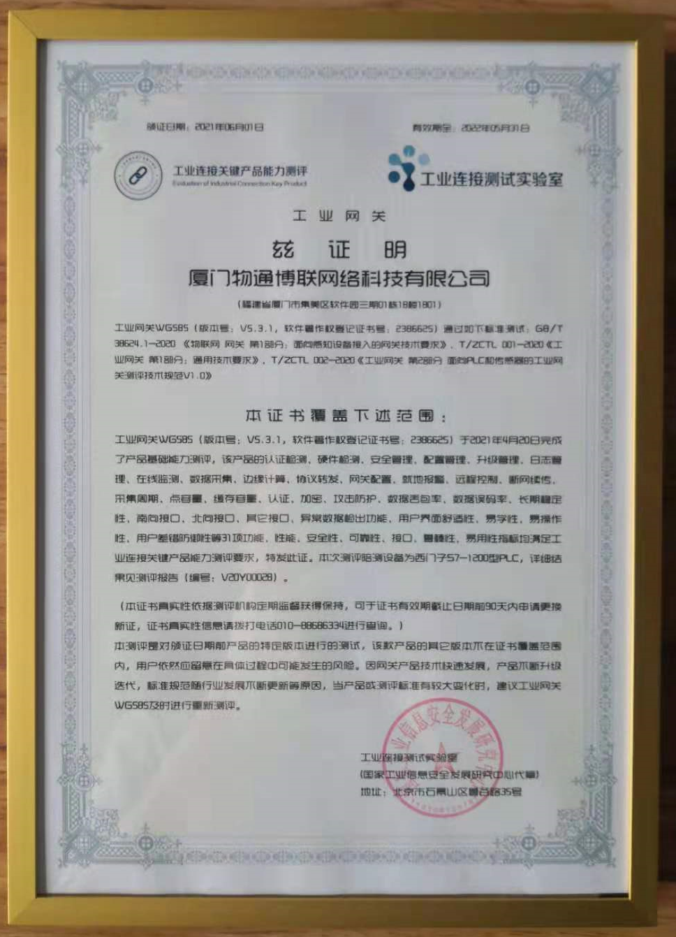 国家工业信息安全开展研究中心和工业互联网技术与产品测试实验室在当天联合发布《工业连接关键技术及产品白名单》。long8龙8国际的工业智能网关顺利获得了工业连接关键产品能力测评,在功能性、性能、安全性、可靠性、接口、鲁棒性、易用性等方面表现优秀,最终入选白名单并取得国家工业信息安全开展研究中心及测评实验室颁发的认证证书。
