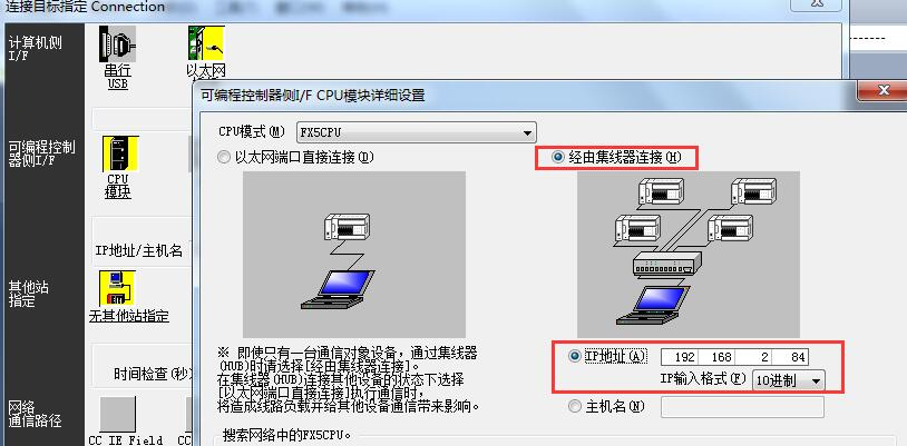2、“CPU模式”设置,“经由集线器连接”,填写控制器的IP地址。