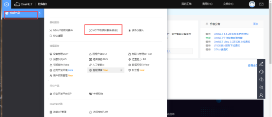 可进入OneNET平台的对应产品中获取网关云服务中心所需要填写的ID和KEY。