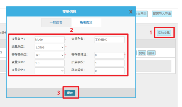 变量配置主要是定义变量名(自定义内容,不可使用中文命名)、变量别名(自定义,可使用中文名字)、寄存器类型和寄存器偏移地址,并定义一些数据规则(如:倍率、小数点、单位、告警)。