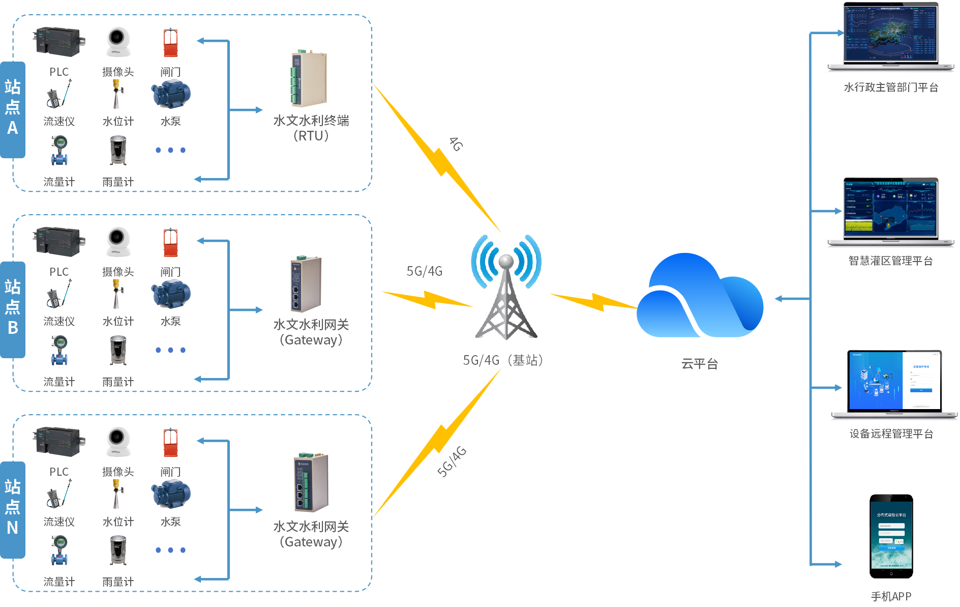 灌区内一体化闸门、水位计、流量计等设备接入long8龙8国际水文水利网关(RTU),并顺利获得5G/4G上传到水行政主管部门平台或其他管理平台中,实现可视化展示并在监测到异常数据时自动告警,从而实现对灌区的渠道水位、流量、水雨情等精确管理。此外,顺利获得告警信息与实时数据,管理人员能够适时调整灌溉取水策略,远程控制闸泵开关,远程查看监控视频,有效提升工作效率与响应水平,保障农业生产正常用水。