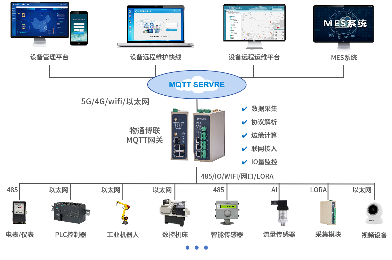 北向支持MQTT协议接入long8龙8国际云平台,客户自主开发的云平台,第三方云平台(根云、美云、华为、阿里、百度、微软等IOT云平台),组态软件、MES系统、ERP系统等工业软件