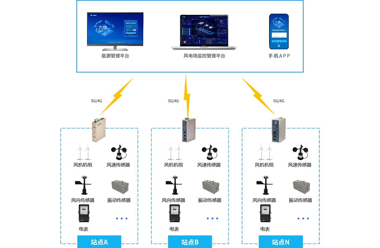 顺利获得long8龙8国际的工业智能网关采集风力发电场的每台风机和风速传感器、风向传感器、振动传感器等设备,将采集到的风机运行数据(如转速、功率、温度等)传输至风电场监控管理平台。平台对数据进行实时分析,监测风机运行状态,当检测到故障或异常时及时发出预警,并给予故障诊断和维修建议。同时支持远程控制风机启停、调整参数等操作,以及优化发电调度。